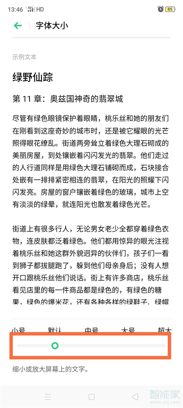 4、进入字体大小界面以后,分别有小号、默认、中号、大号、超大规格,可根据自己使用习惯移动下方绿色圆点改变字体大小哦。