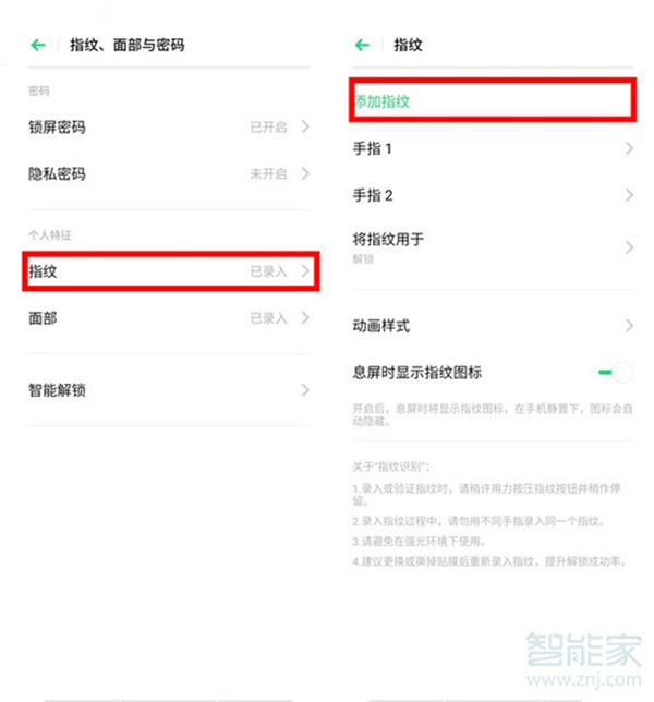 2.接下来,点击【添加指纹】按钮,按照提示将手指放在手机屏幕上的指纹识别传感器上,录入自己的指纹即可。