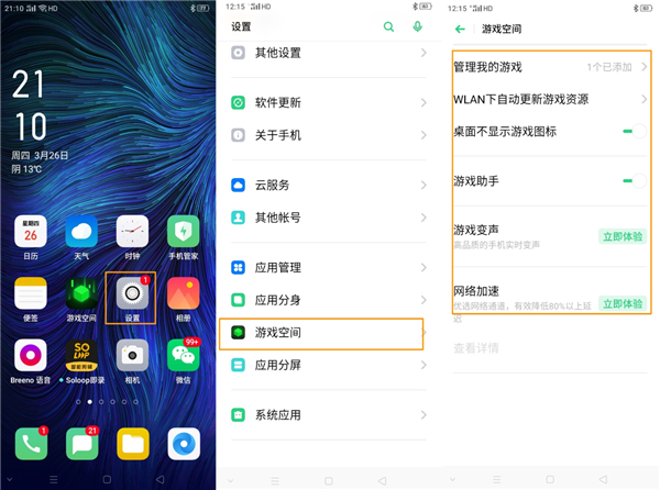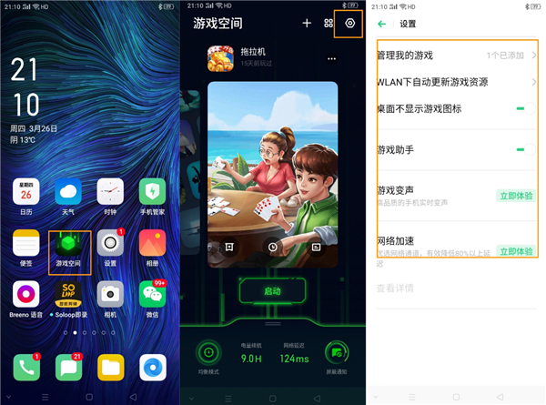 1、在手机桌面找到【游戏空间】—点击右上角的设置图标进入,开启【游戏助手】的开关。