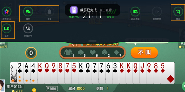 3、点击你想玩的游戏进入,在横屏状态下,从屏幕顶部两侧向下滑动,即可呼出【游戏助手】界面。如果想边玩游戏边和好友聊天,可以点击【微信】或者【QQ】进入,进行相关操作即可。如果想将精彩的游戏视频或截屏部分,分享给其他小伙伴看,可以点击【录屏/截屏】,然后进行相关分享就好啦~