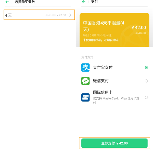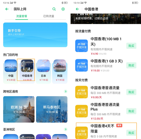2、点击需要购买上网服务的某个国家或地区套餐(这里以:香港为例)—点击购买—选择购买天数(以4天为例)—完成付款。