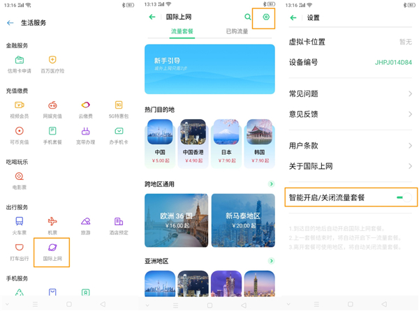 通过桌面的【钱包】—【更多】—【国际上网】点击右上角【设置】图标—【智能开启/关闭流量套餐】开关打开。