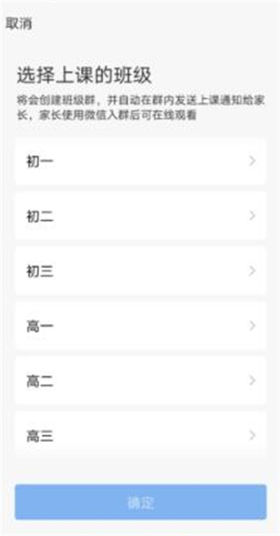 4、之后再设置要上直播课的年级段,然后再设置要上直播课的班级后点击【确定】功能。