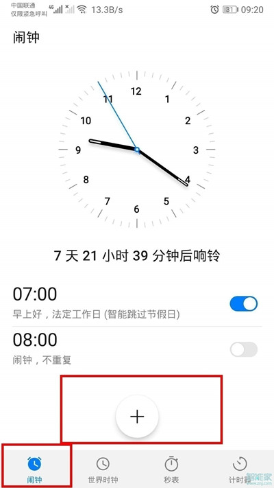 2、点击闹钟选项,就可以看到我们设置的闹钟,如果要新建闹钟,点击底部的“+”号新建闹钟。