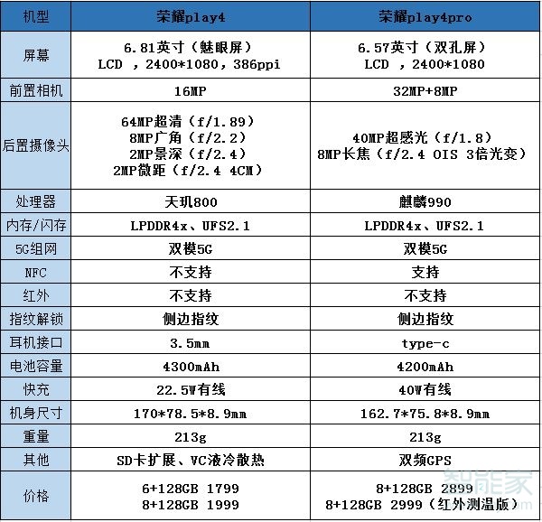 荣耀play4和荣耀play4pro区别?详细参数对比图: