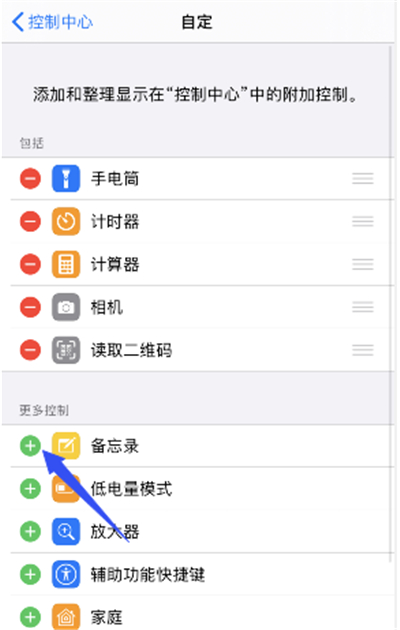 2、点击自定控制,点击备忘录前面的添加按钮。