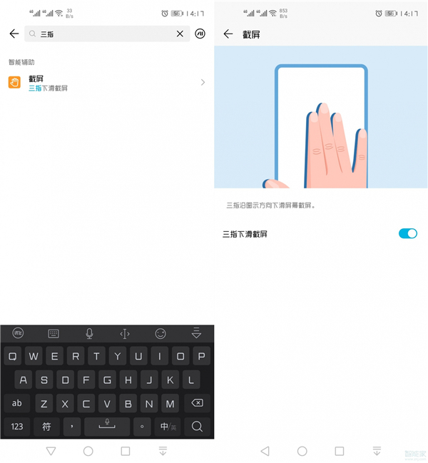 3、打开手机设置,在上方搜索框中“三指”,找到三指截屏,将三指下滑截屏开关开启,然后进入要截图的页面,使用三指下滑即可截屏。
