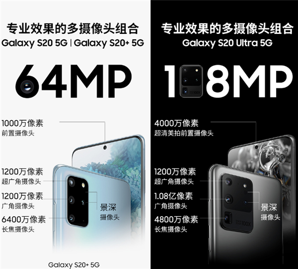 三星Galaxy S20+配备1200万像素主摄+6400万像素长焦镜头+1200万像素超广角镜头+ToF景深镜头的四摄组合,支持3倍光学变焦,30倍数码变焦以及8K视频录制。