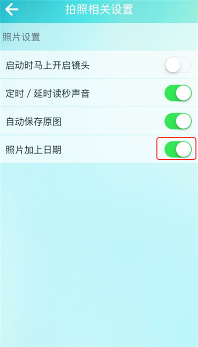 4、点击”更多“,进入”拍照相关设置“,将”照片加上日期“后面的开关开启即可