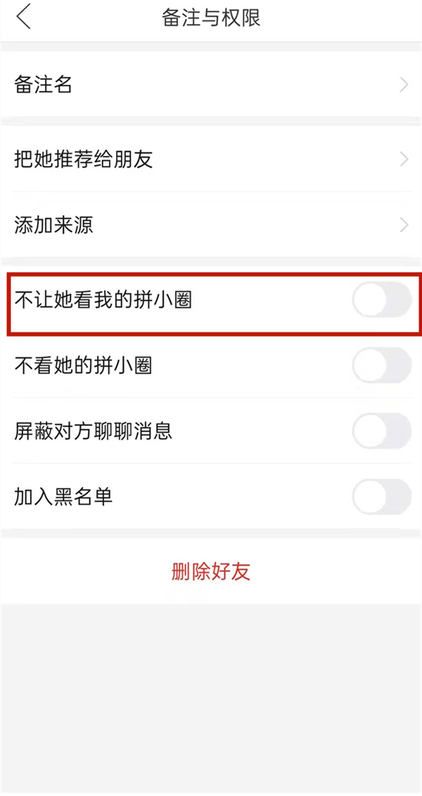 4、将不让她看我的拼小圈右侧按钮开启即可。