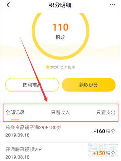 4、即可查看到积分的明细情况,如全部记录、只看收入、只看支出等