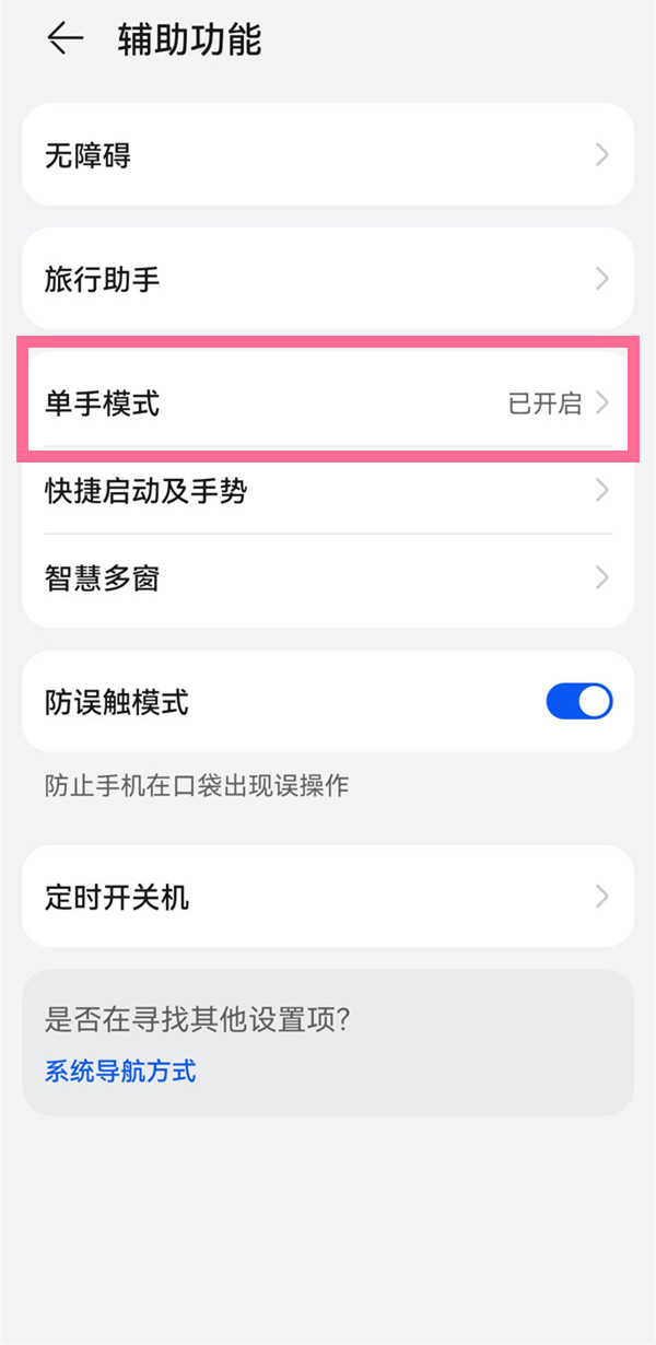 2、点击【单手模式】并开启。开启后沿屏幕底部横滑并停顿即可进入单手模式。