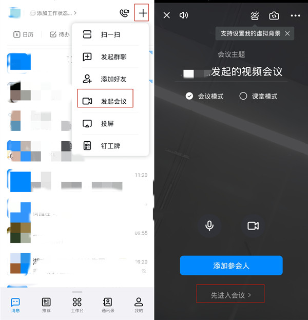 1、打开手机钉钉,点击右上角【+】,点击发起会议,点击【先进入会议】。