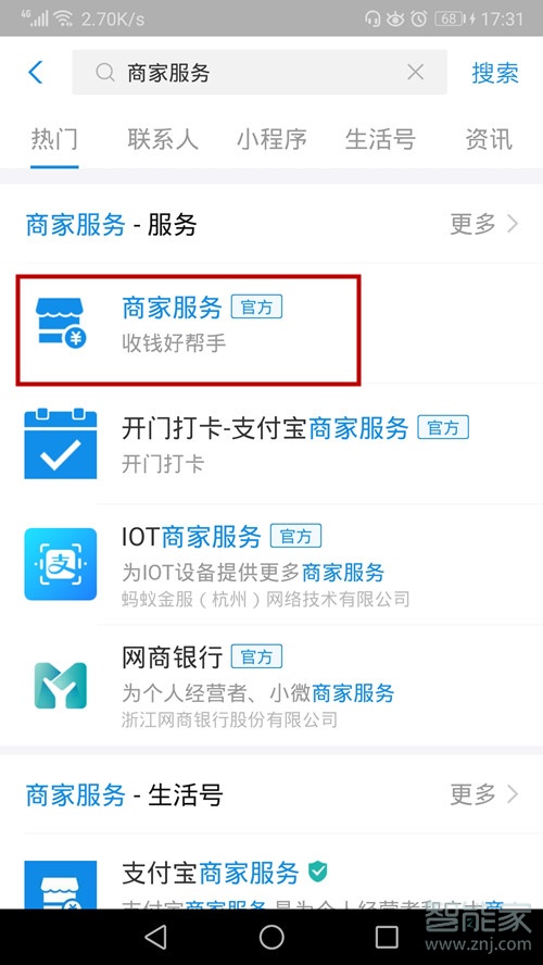 1、在支付宝首页上方搜索框中输入“商家服务”。