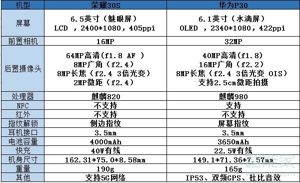 ️5、其他方面:华为p30比荣耀30S多了IP53级防水防尘、双频GPS、NFC以及杜比音效。