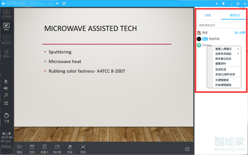 1、老师在界面右侧成员区用鼠标右键单击某个学员。