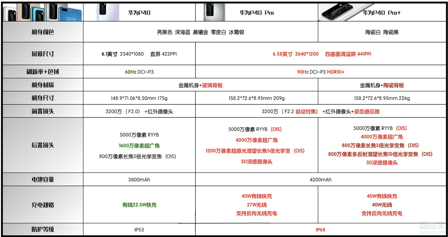 ️前置镜头:三者均是前置3200万像素+红外镜头双摄,但相比P40,P40Pro和P40Pro+多了自动对焦功能和姿态感应器功能。
