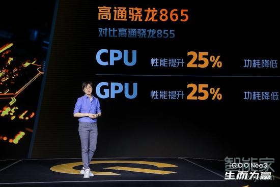 iqooneo3搭载了骁龙865处理器,与骁龙855相比,CPU性能提升25%,功耗降低25%;GPU性能提升25%,功耗降低35%。