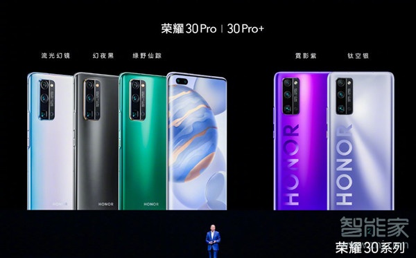荣耀30pro有幻夜黑、绿野仙踪、流光幻境、钛空银、霓影紫五种颜色,其中钛空银、霓影紫两个版本的背面加入了荣耀大logo标识。