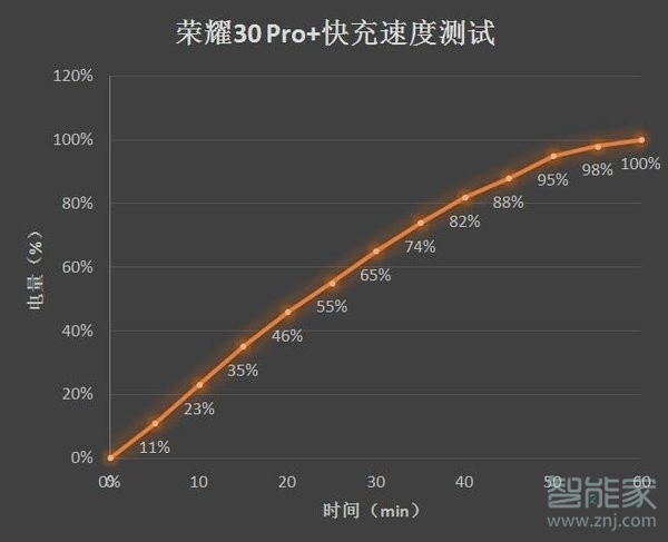 将荣耀30pro+放电至关机进行实测,测试结果显示,荣耀30pro+半小时充到65%,充电至90以后速度放缓,充满100%共计59分钟。