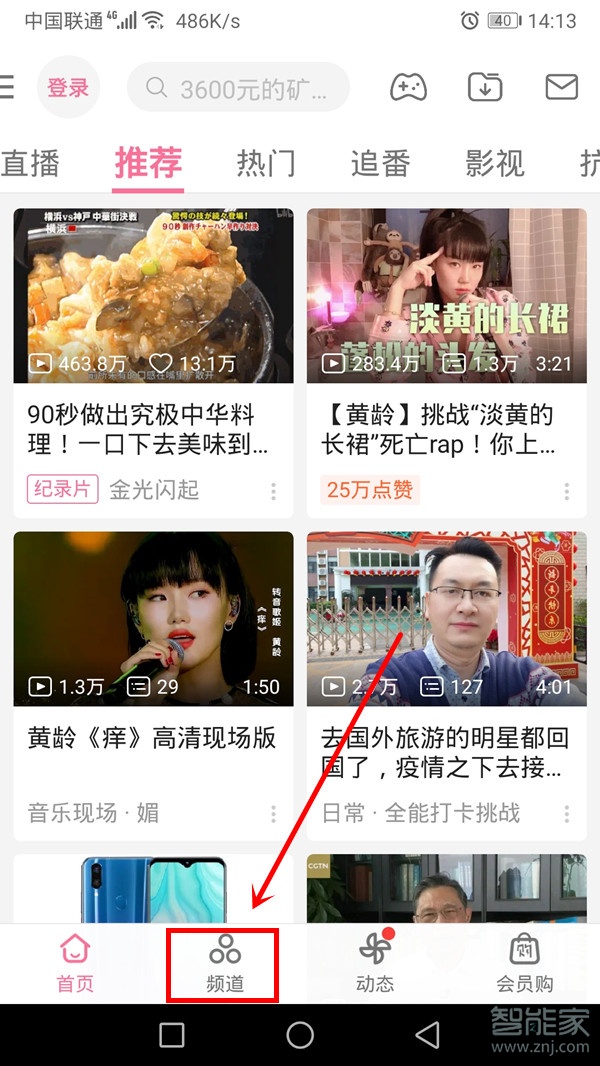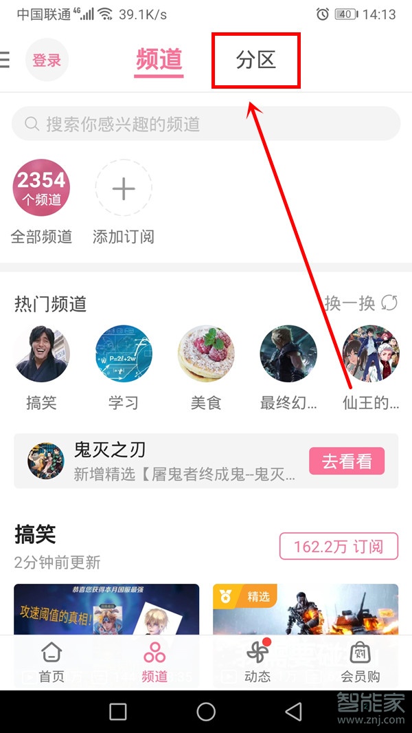 1、打开哔哩哔哩,在主页下方点击“频道”。