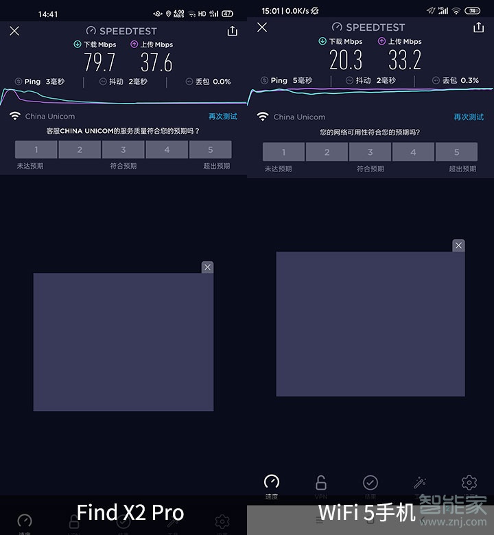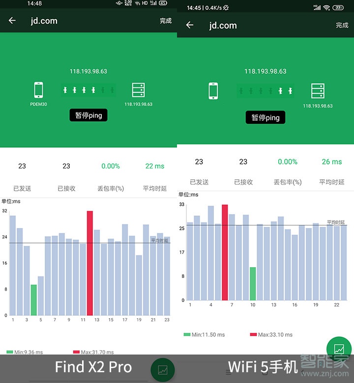 除此以外,我们还进行了网络延时对比。网络延时同样也是非常重要的体验,比如在生活中,Ping值的高低差别虽然只有零点几秒,但会影响到用户的抢购结果。对比测试结果显示,findx2pro的平均延时和最小延时都要比wifi5手机低。
