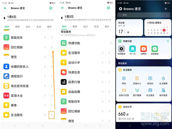 2、如果想让生活服务在负一屏最上方显示,长按生活服务后面的【三横】图标,往上拖动生活服务再松开。再回到负一屏即可看到相关服务应用,如下图: