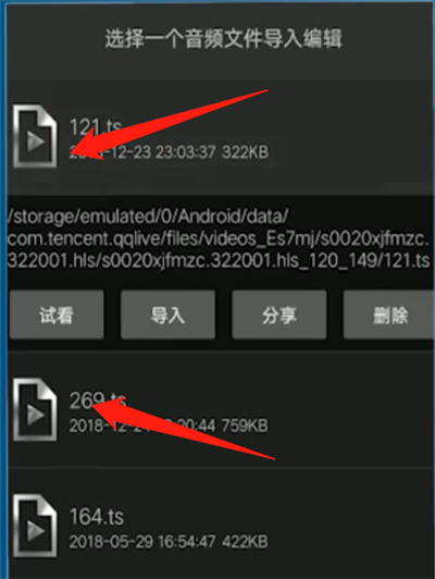 2.输入文件名中的关键字,搜索音乐,点击“121.ts”与“269.ts”,将它们都导入。