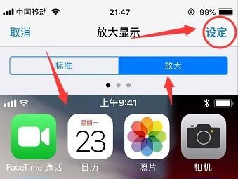4、选择【标准】或【放大】,然后点击页面右上角的【设定】。