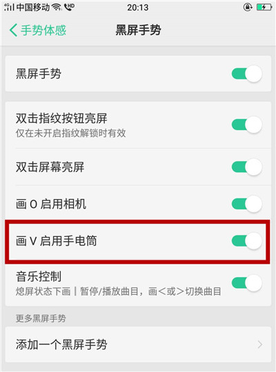 6.之后我们需要在手机黑屏状态下使用手电筒,我们画”V“即可打开手电筒。