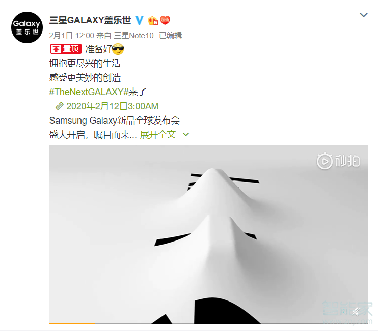 2月1日午间,三星手机官方微博宣布,三星S20系列新品发布会将于2月12日周三凌晨3点举行,主题为“TheNextGALAXY”。