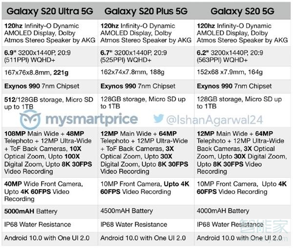 S20系列将继续搭载高通、三星双旗舰平台,分别是骁龙865、Exynos 990,均支持双模5G、3200×1440分辨率和120Hz刷新率、最高12GB内存、矩阵造型后置四摄、IP68防水防尘、AKG Dolby Atoms立体声扬声器。