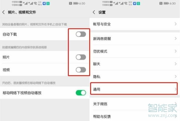然后关闭微信自动缓存照片,【微信】-【我】-【设置】-【通用】-关闭【照片】、【视频】和【自动下载】后面的开关即可。