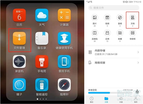 华为手机下载的文档默认都放在【文件管理】里面,点击打开【文件管理】,点击【分类】,点击【文档】即可看到所有文档。