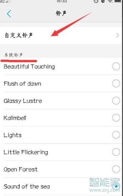 2、在系统铃声里找到喜欢的铃声,或者点击最上面的自定义铃声。