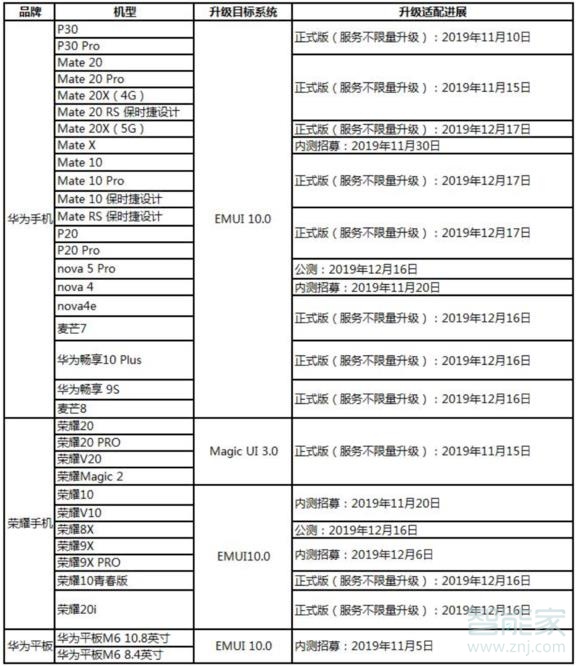 目前有多款手机已经可以更新EMUI10,包括华为P30、P30 Pro、Mate20、Mate20 Pro、Mate20 X(4G)、Mate20 RS保时捷设计、Mate20 X(5G)、Mate X、Mate10、Mate10 Pro等华为机型,还包括荣耀10、荣耀20i、荣耀V10、荣耀9X和荣耀10青春版等荣耀机型。