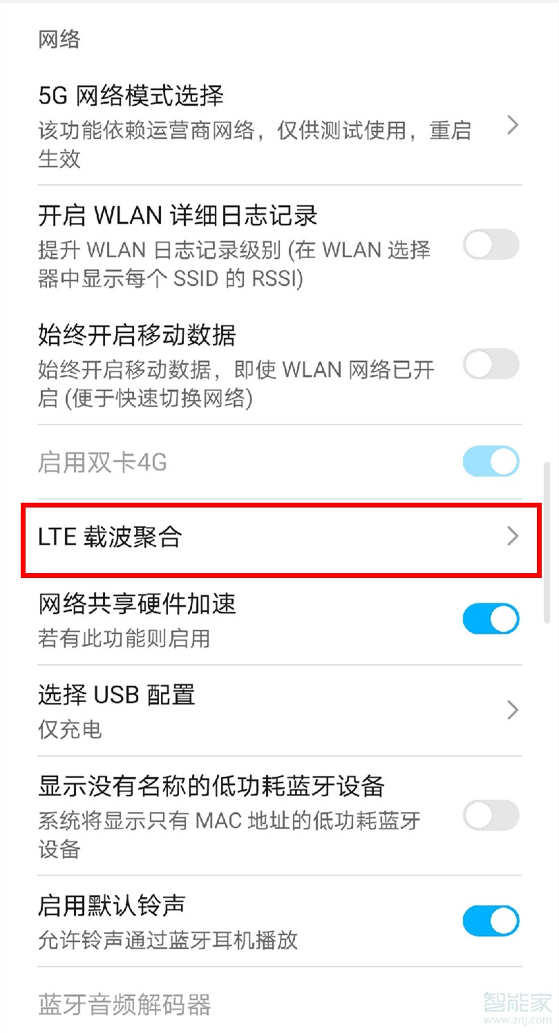 2、返回设置界面,搜索并点击LTE 载波聚合,打开LTE 载波聚合和LTE高速率模式。