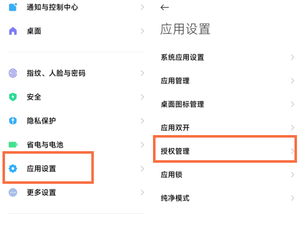 1、打开手机设置,点击应用设置,再点击授权管理。