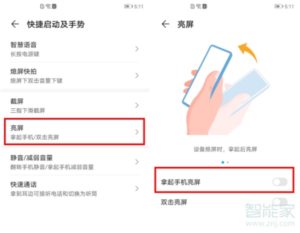 3、点击进入【亮屏】,将【拿起手机亮屏】右侧的开关打开。