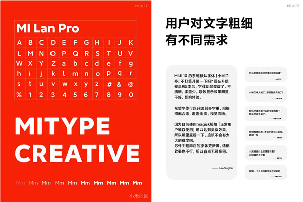 全新的小米兰亭Pro,中文字形更瘦更优美,全新西文设计,同时调整了字体基线位置,混排阅读更加舒适。MIUI11推出动态字体系统:①无级调节字体粗细,每个人都能找到自己舒适的阅读字重。②根据内容给予不同程度加粗。③交互细节得以上升到全新层面。