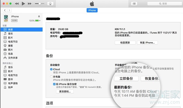 2.在电脑上安装并打开iTunes软件,点击左上角的小手机图标后,将iPhone手机上的所有数据都备份到电脑上来。