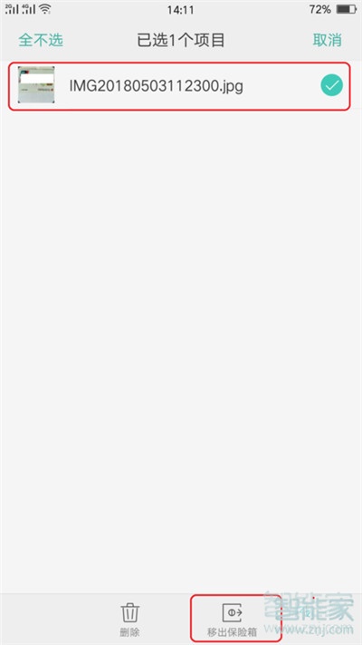5、进入以后,将要解除隐藏的照片勾选上,然后点击移出保险箱,这样就可以将照片解除隐藏状态了。