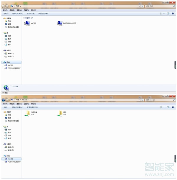 2、在桌面快捷方式找到网络,并点进去,找到电脑端设置的名字,比如我这个是Mate9,然后点击,里面有两个选择,第一个是直接输入所设置密码,第一个不行的话,就点击第二个其他账户,输入最开始设置的账号和密码,点击登录即可。登录完毕以后如下图所示,就可以对手机里面的相册以及其他文件进行操作。