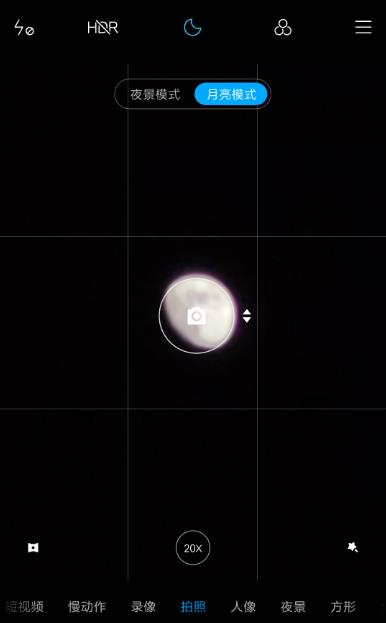 2、开启相机,拍照模式下,对准要拍摄的月亮然后开启AI相机,轻触屏幕进行对焦,将变焦倍数调至4倍以上,会自动识别并显示已进入月亮模式,点击拍摄键即可完成月亮拍摄。