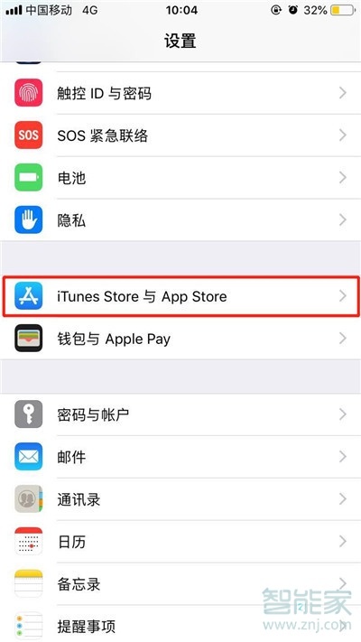 2、往下滑动菜单选项,找到并且点击【iTunes Store与App store】。