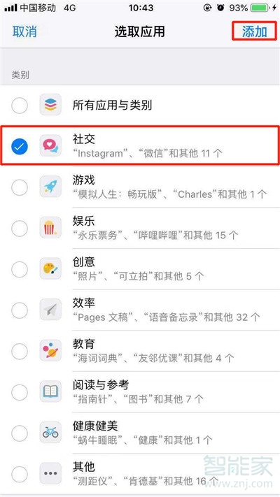 4、点击【添加限额】之后,选择想要限额的应用类别,比如点击【社交】,然后点击【添加】按钮。