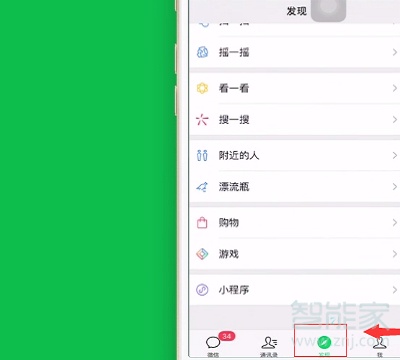 1.打开手机,打开微信,在微信主页面内点击界面下方的“发现”选项。