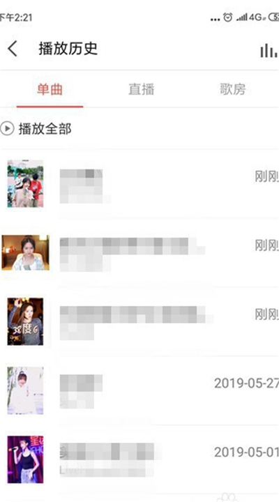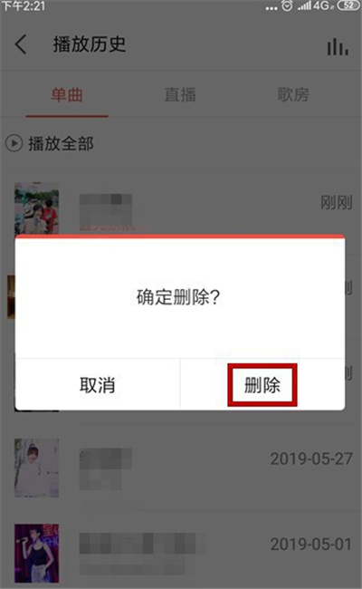 4、在播放记录中首先是单曲,这个也就是平时看的k歌视频,长按要删除的足迹;