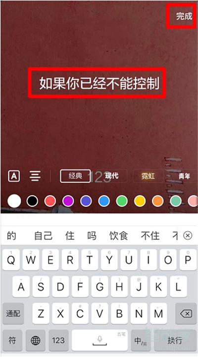 4.把歌词一句一句全都输进去,即输入一句歌词后点击“完成”,接着再输入一句,直到歌词全部输完(也可以更改文字颜色)。