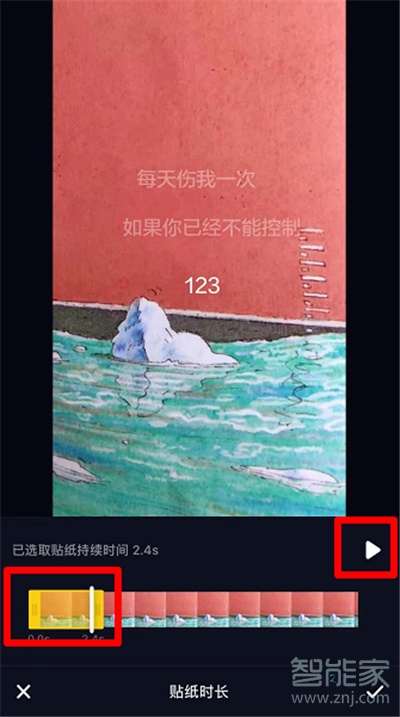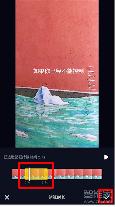 6.在这里就可以卡文字时间了,点击播放按钮,按住轨道右侧的黄框往左拖动,根据音乐卡时间,下方会显示秒数,卡准后点击“对勾”。